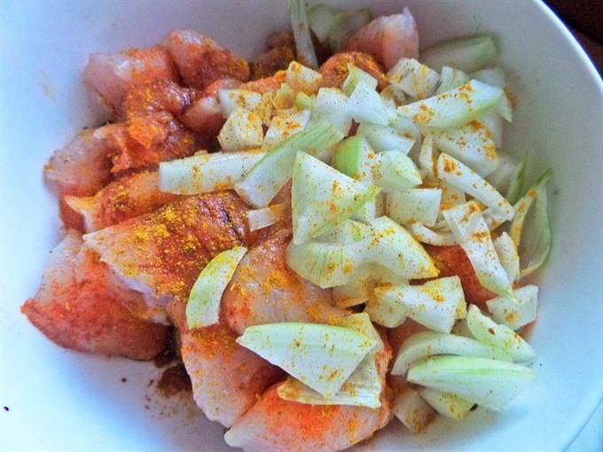 Всыпать порубленный лук. Обвалять в маринаде и оставить минут на 15 — 20.