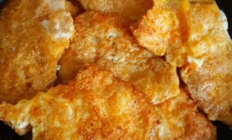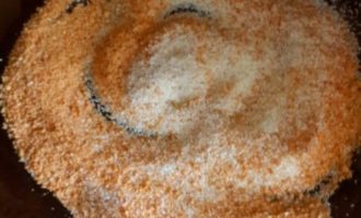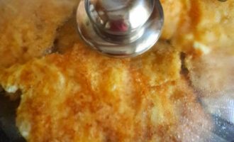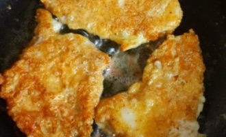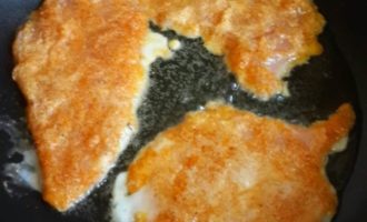 • Налить масло и разогреть сковородку. Обмакнуть мяско в панировку, потом в яйцо, потом опять в панировку, потом в яйцо и на сковородку.