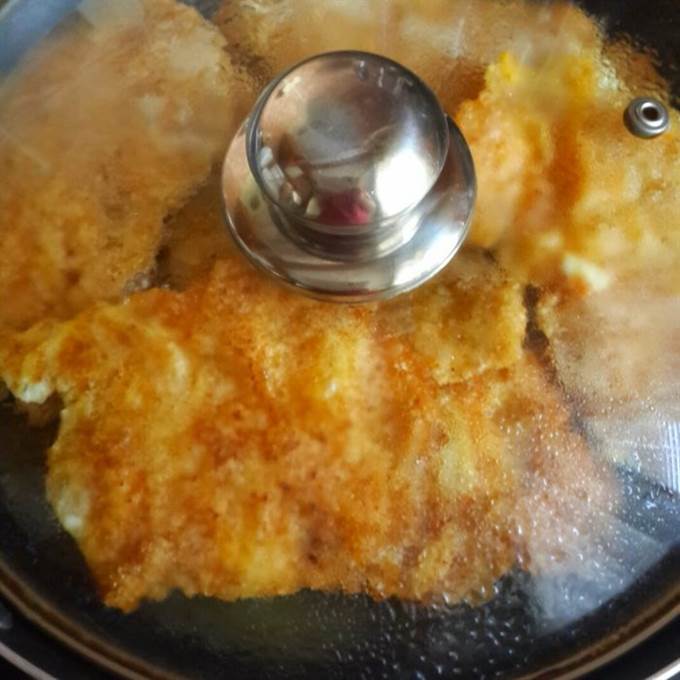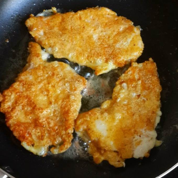 • Налить масло и разогреть сковородку. Обмакнуть мяско в панировку, потом в яйцо, потом опять в панировку, потом в яйцо и на сковородку.