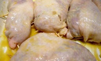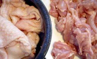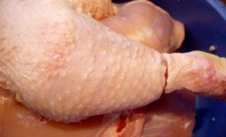 • Для начала освободим бедрышки с ножками от кожицы. У меня было их шесть штучек. Промоем мясо и обсушим полотенцем. Подрежем кожу по кругу над хрящиком. И, начиная сверху, помогая себе маленьким острым ножом, снимем кожу.