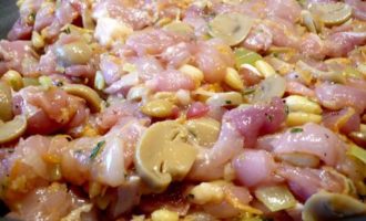 • Освободим мясо от сухожилий и нарежем небольшими кусочками. Лук (я использовала только белую часть) очистим и порежем мелко, морковь очистим и потрем на мелкой терке. Сельдерей очистим и порежем мелко. Грибы освободим от жидкости и порежем тонким колечком. Обжарим лук и морковь в оливковом масле, добавим грибы и обжарим все вместе. Снимем с огня, дадим пару минут подстыть. Смешаем с мясом, посолим, поперчим, добавим петрушку, обжаренные на сухой сковороде орешки. Все перемешаем. Разделим начинку на количество ножек.