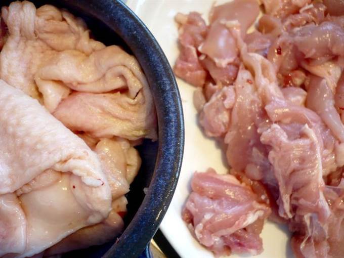 • Для начала освободим бедрышки с ножками от кожицы. У меня было их шесть штучек. Промоем мясо и обсушим полотенцем. Подрежем кожу по кругу над хрящиком. И, начиная сверху, помогая себе маленьким острым ножом, снимем кожу.