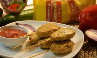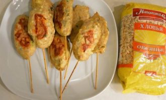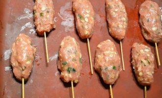 Слепить котлетки и насадить на шпажки, предварительно смоченные водой.