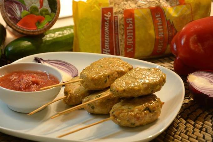 Слепить котлетки и насадить на шпажки, предварительно смоченные водой.