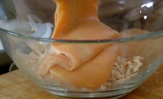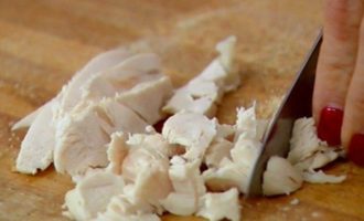 Куриную грудку отварить, затем остудить и мелко порубить.