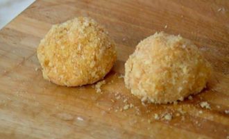 Сформировать из куриной массы шарики, обвалять их в хлебных крошках, затем обмакнуть в яйцо и еще раз обвалять в сухарях.