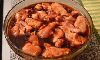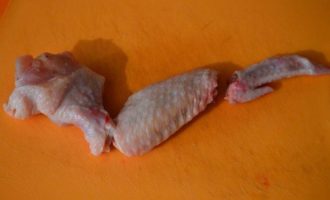Крылышки тщательно промыть под проточной водой, дать стечь жидкости (легко это делать по суставным косточкам). Самая маленькая часть нам не пригодится, я её выбросила.