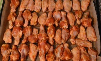 Духовку разогреть до 180С. Крылья выложить на пергамент, ничем не смазывать — они не пригорят. Выпекать около 1 часа до золотистой, поджаренной корочки, как вы любите!