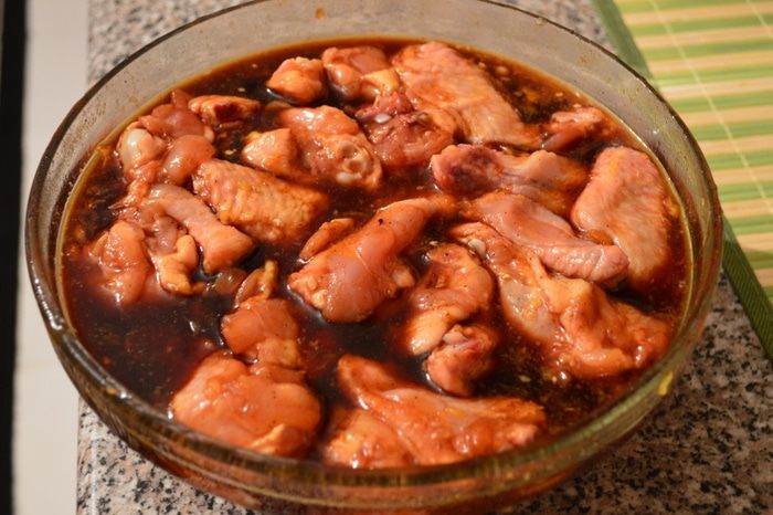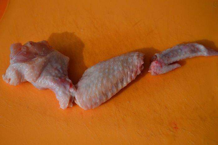 Крылышки тщательно промыть под проточной водой, дать стечь жидкости (легко это делать по суставным косточкам). Самая маленькая часть нам не пригодится, я её выбросила.