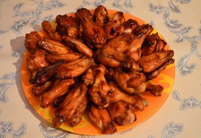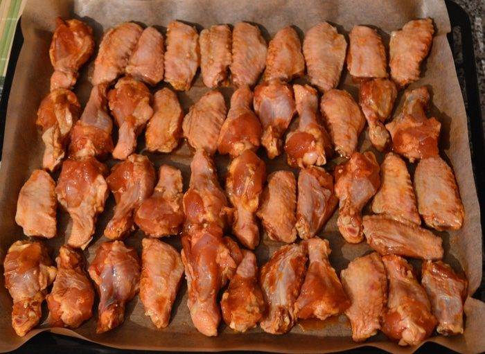 Духовку разогреть до 180С. Крылья выложить на пергамент, ничем не смазывать — они не пригорят. Выпекать около 1 часа до золотистой, поджаренной корочки, как вы любите!
