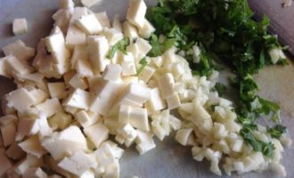 Зелень и чеснок мелко порубите. Сыр порежьте маленькими кубиками. Перемешайте.