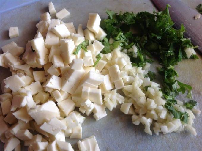 Зелень и чеснок мелко порубите. Сыр порежьте маленькими кубиками. Перемешайте.