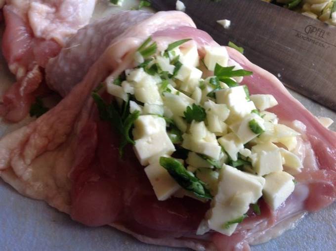• В куриные ножки (у меня были сразу без косточки) вместо кости положите сырную начинку, и заверните так, чтобы начинка не выпадала.