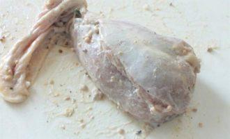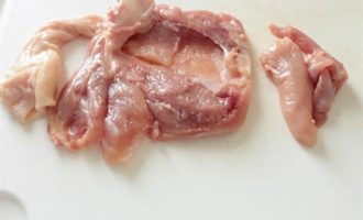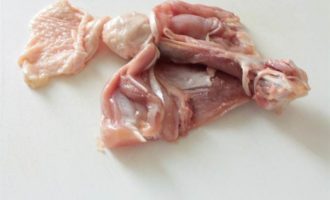 Куриные ножки помыть, почистить и обсушить полотенцем. Аккуратно отделить кожицу и затем мясо от косточки.