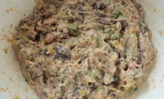 Приготовить фарш из срезанных кусочков мяса. С десяти ножек у меня получилось 200 граммов. Шампиньоны нарезать мелко, лук-порей полукольцами. В сковороде с растительным маслом обжарить шампиньоны до испарения жидкости, добавить лук-порей, перемешать и прогреть 2 минуты, остудить. Добавить к мясному фаршу. Добавить остальной сыр, желток одного яйца, столовую ложку белых панировочных сухарей, зелень петрушки и соль, перец по вкусу, хорошо перемешать.