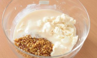 От общего количества сыра отделить 2 столовые ложки, добавить горчицу, давленый чеснок, ряженку, хорошо перемешать (я покупала сливочный сыр в ведерке, весом 150 г).