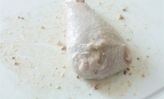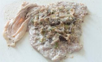 Отбить с двух сторон каждую мясную заготовку, (кожица находится в стороне, что бы случайно ее не повредить)Посолить и поперчить отбитое мясо по вкусу.