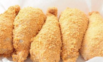 Форму для запекания выстлать пергаментом, смазанным небольшим количеством растительного масла.Каждую ножку обвалять в панировке(я покупаю панировочную смесь с паприкой, она ярче и ароматней). Выкладываем в форму.Я пользуюсь стеклянной формой и ставлю ее в еще не нагретую духовку.Температуру выставляем на 180 градусов, запекать 1 час в режиме верхнего и нижнего нагрева. Готовые ножки подаем с салатом или любимым гарниром. Приятного вам аппетита!