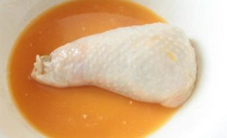 В мисочке взбить оставшийся яичный белок и одно яйцо с щепоткой соли.Каждую ножку обвалять в муке, затем окунуть в яичную смесь