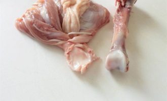 Теперь отделяем саму косточку от хрящика, на котором держится кожица вместе с мясом, вот так. Не бойтесь, делайте это аккуратно, у вас все получится.