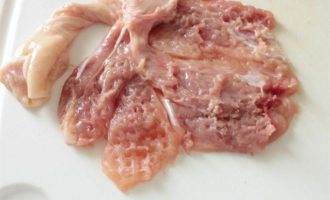 Теперь надо удалить твердые жилки, срезать мелкие кусочки мяса, выровнять поверхность. Все обрезанные кусочки мы используем для фарша-начинки. Так поступаем со всеми ножками.