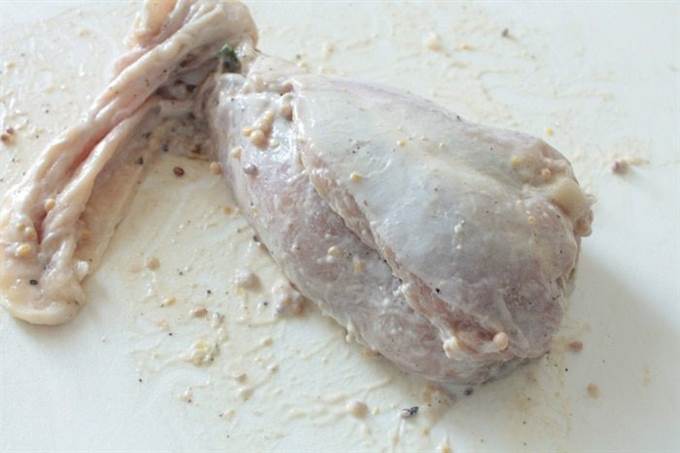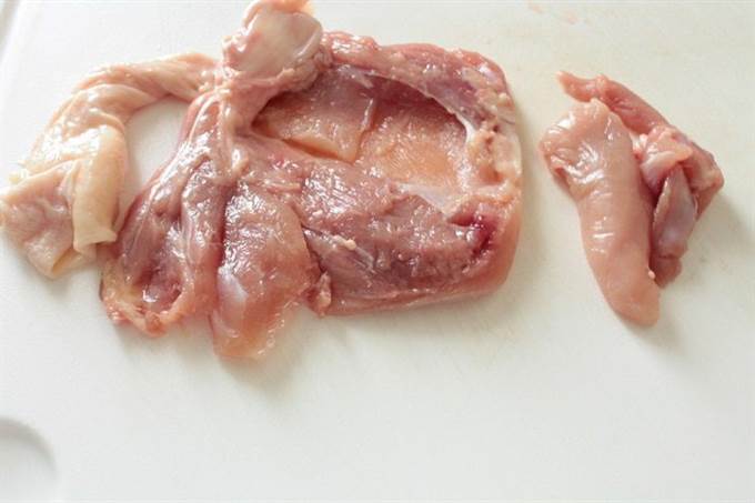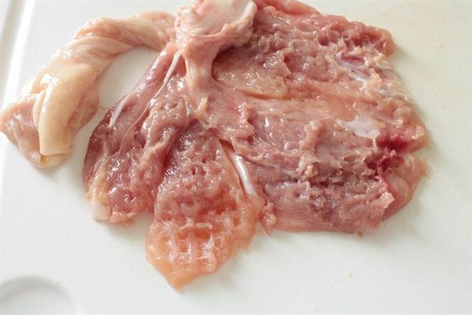 Теперь надо удалить твердые жилки, срезать мелкие кусочки мяса, выровнять поверхность. Все обрезанные кусочки мы используем для фарша-начинки. Так поступаем со всеми ножками.