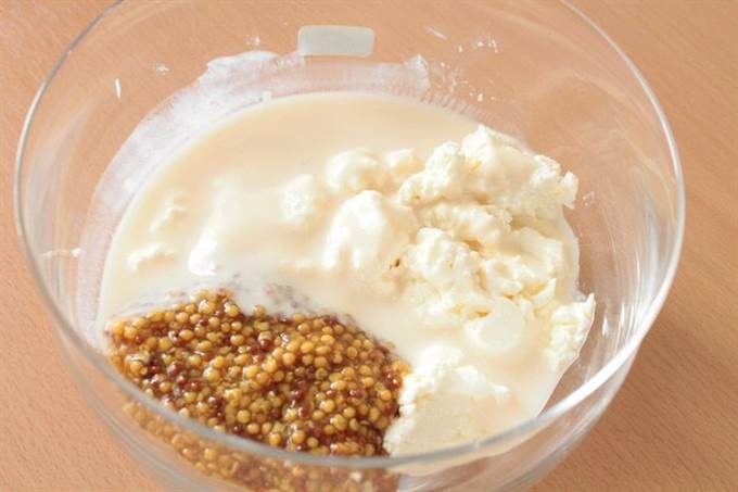 От общего количества сыра отделить 2 столовые ложки, добавить горчицу, давленый чеснок, ряженку, хорошо перемешать (я покупала сливочный сыр в ведерке, весом 150 г).