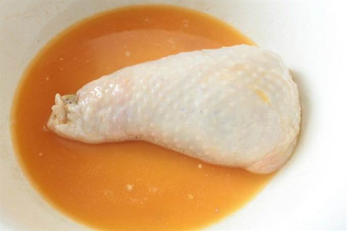 В мисочке взбить оставшийся яичный белок и одно яйцо с щепоткой соли.Каждую ножку обвалять в муке, затем окунуть в яичную смесь