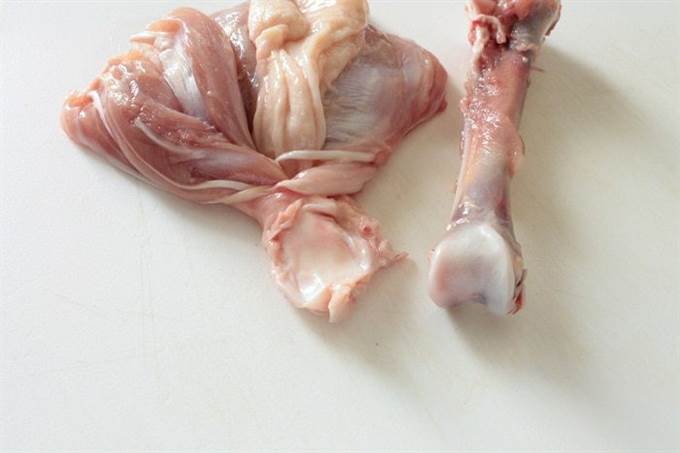 Теперь отделяем саму косточку от хрящика, на котором держится кожица вместе с мясом, вот так. Не бойтесь, делайте это аккуратно, у вас все получится.