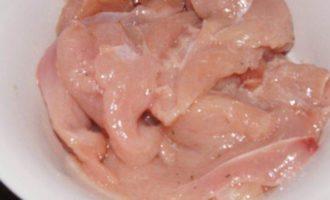 Куриное филе отбить, посолить, поперчить, сбрызнуть лимонным соком и растительным маслом. Оставить мариноваться в холодильнике на 30 минут.