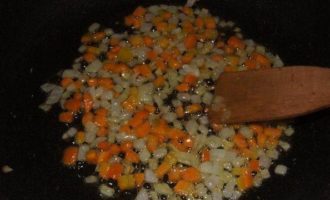 В сковороде разогреть сливочное и ложку растительного масла. Морковь и лук порезать кубиками и обжарить на среднем огне минут 10-12.