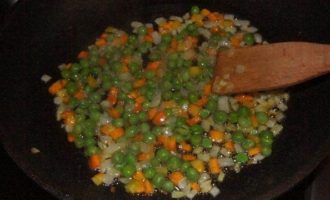 Зеленый горошек (предварительно достать из морозилки) всыпать к луку с морковкой. Готовить еще 10 минут, приправив прованскими травками или любыми на ваш вкус специями.