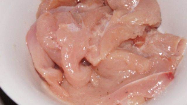 Куриное филе отбить, посолить, поперчить, сбрызнуть лимонным соком и растительным маслом. Оставить мариноваться в холодильнике на 30 минут.