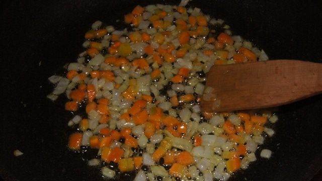 В сковороде разогреть сливочное и ложку растительного масла. Морковь и лук порезать кубиками и обжарить на среднем огне минут 10-12.