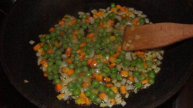 Зеленый горошек (предварительно достать из морозилки) всыпать к луку с морковкой. Готовить еще 10 минут, приправив прованскими травками или любыми на ваш вкус специями.