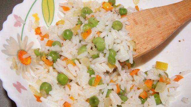 Смешать рис с овощами.