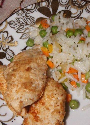 Достать из духовки куриную отбивную и подавать с рисом.