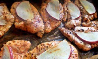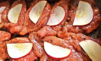 • Сверху на каждый куриный кусочек положить дольку сочного яблока. Они обменяются соками и будет вкусно.