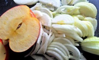 • Крупное яблоко нарезать на дольки. Лук тоже полукольцами.