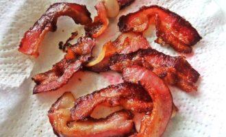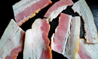 • В это время бекон делим пополам, если длинные кусочки.