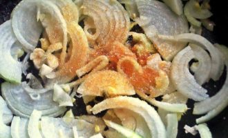 • В той же сковороде после бекона начинаем обжаривать луковые полукольца, присыпав сахаром. Тушим до карамельного состояния. Забегая вперед, признаюсь, что лук карамелизировала повторно… по заявкам едоков.