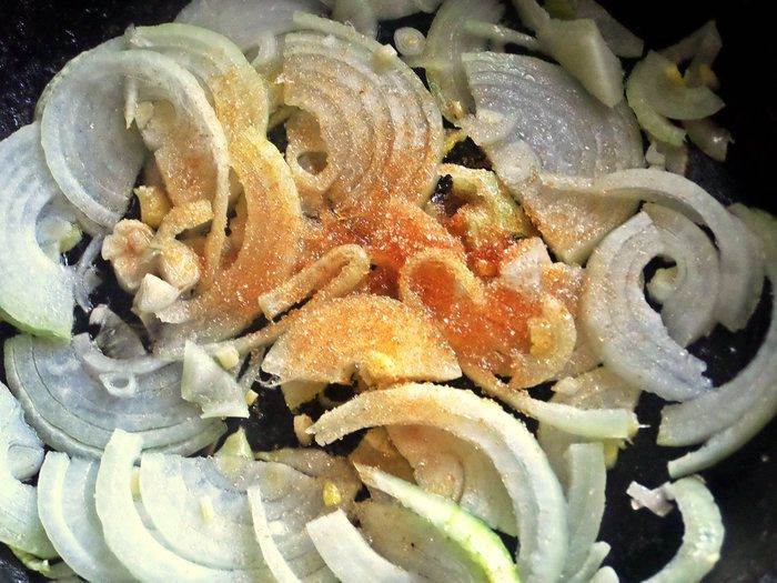 • В той же сковороде после бекона начинаем обжаривать луковые полукольца, присыпав сахаром. Тушим до карамельного состояния. Забегая вперед, признаюсь, что лук карамелизировала повторно… по заявкам едоков.