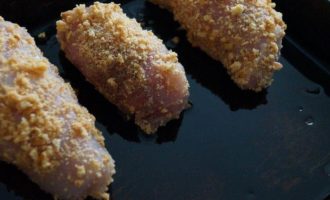 Обмакнуть во взбитое яйцо и обвалять в крошках, сделанных из крекера. Выложить на противень смазанный маслом и поставить в разогретую духовку на 20 минут.
