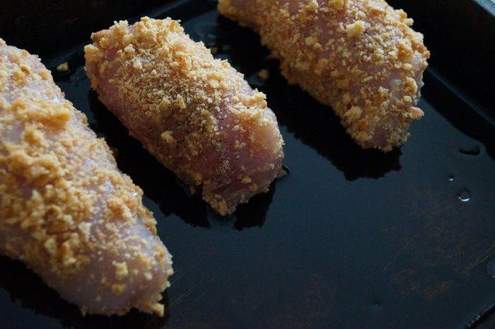 Обмакнуть во взбитое яйцо и обвалять в крошках, сделанных из крекера. Выложить на противень смазанный маслом и поставить в разогретую духовку на 20 минут.