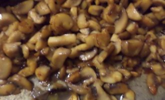 • Луковицу очистить и нарезать маленькими кубиками. В сковороде разогреть половину растительного масла и подрумянить лук. Добавить нарезанные шампиньоны, посолить, добавить чёрный перец и смесь перцев, и обжаривать, помешивая, около 15 минут.