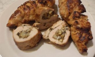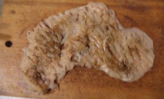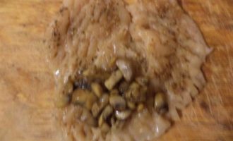 • Куски филе разложить на рабочем столе. Выложить на филе начинку.
