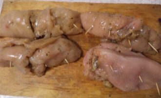 • Свернуть филе рулетиком и скрепить зубочисткой.