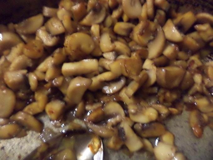 • Луковицу очистить и нарезать маленькими кубиками. В сковороде разогреть половину растительного масла и подрумянить лук. Добавить нарезанные шампиньоны, посолить, добавить чёрный перец и смесь перцев, и обжаривать, помешивая, около 15 минут.
