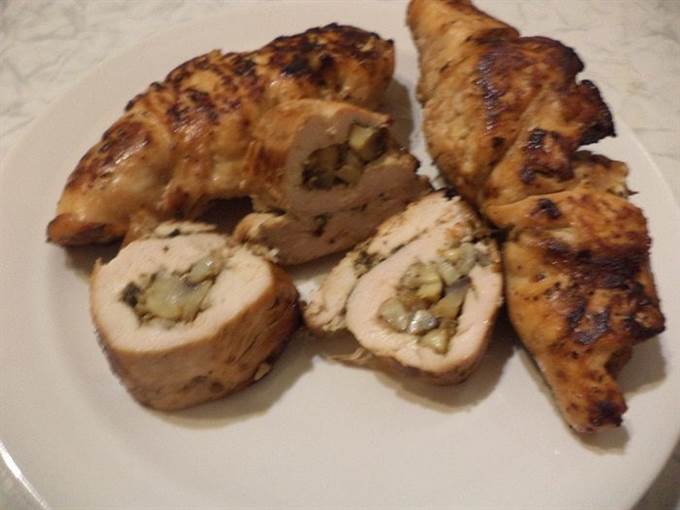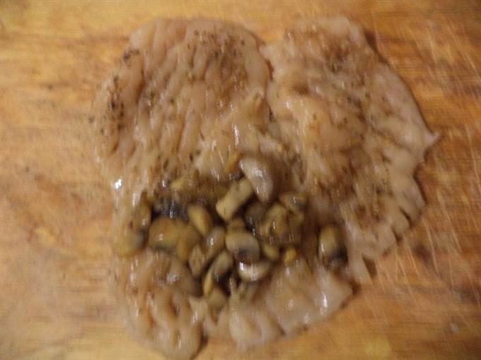 • Куски филе разложить на рабочем столе. Выложить на филе начинку.