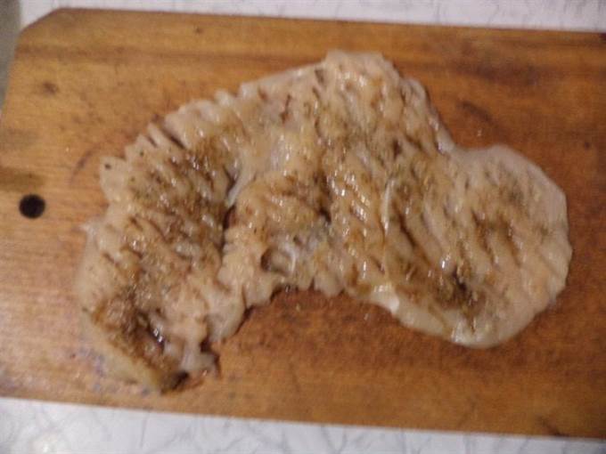 • Куриное филе вымыть, обсушить, каждое разрезать таким образом, чтобы получился ровный пласт.